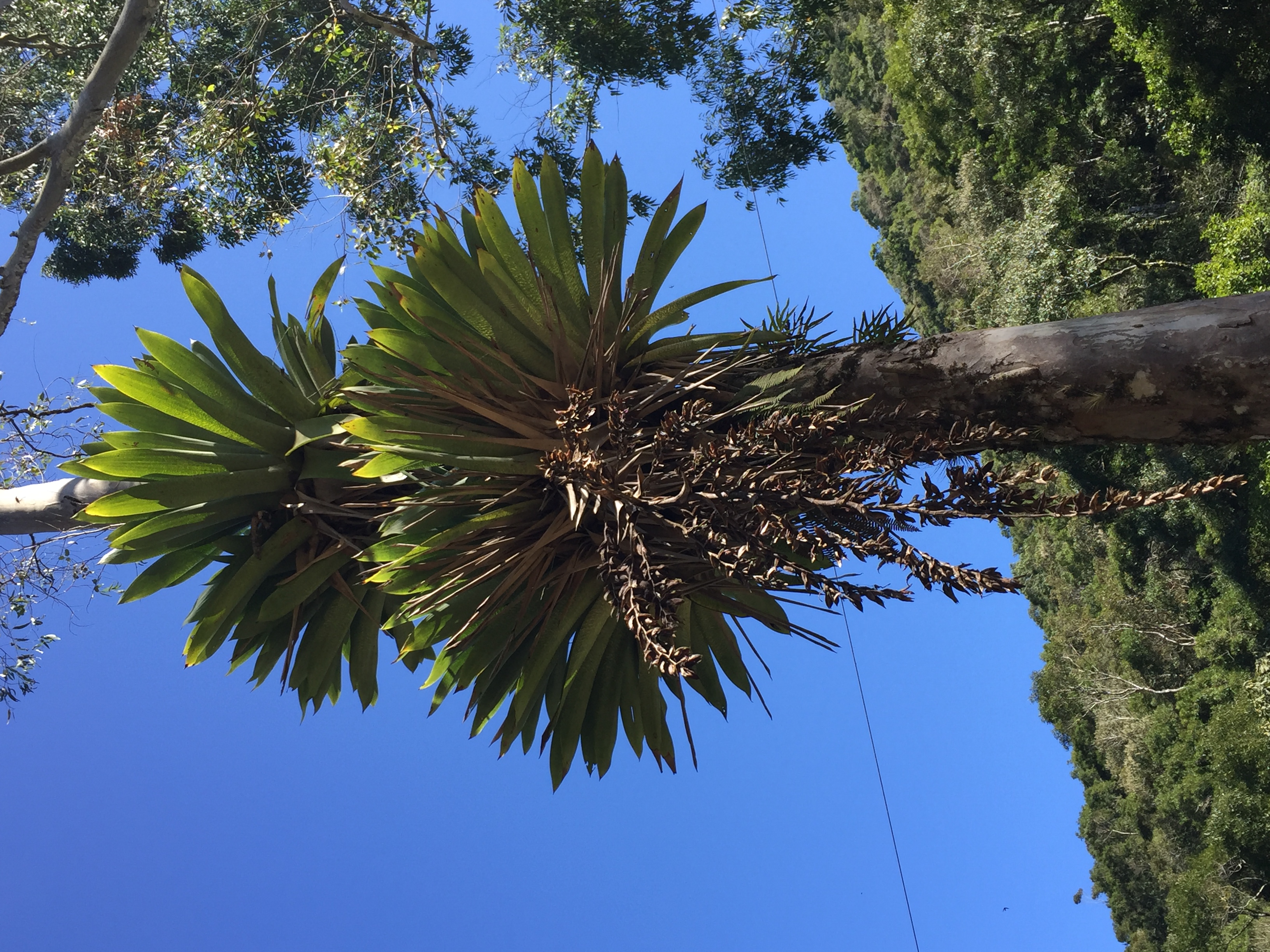 Esta imagem está mostrando uma árvore longa que é estranha pois tem duas plantas redontas grudadas na árvore e a árvore é peluda! Sei que esse tipo de pelo na árvore é um parasita para as plantas, mas e as duas plantas, o que elas são e como elas chegaram ali? bIzArRO não é?