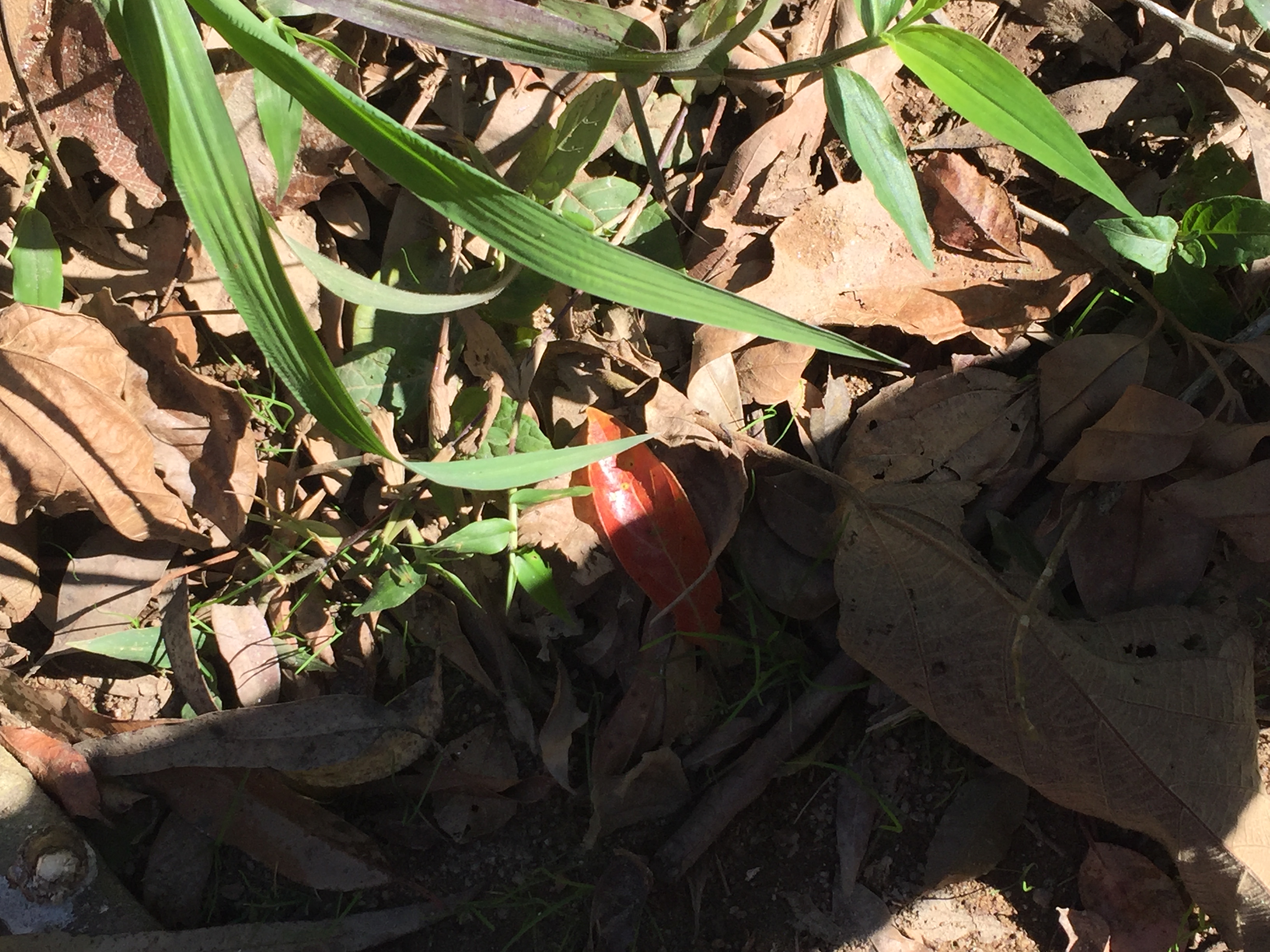 Uma folha vermelha no meio das folhas marrons que estão mortas e as folhas verdes que estão vivas em volta. Como será que uma folha vermelha chegou no meio das folhas verdes e marrons? bIzArRO né?Esta foto foi tirada em Anitápolis!