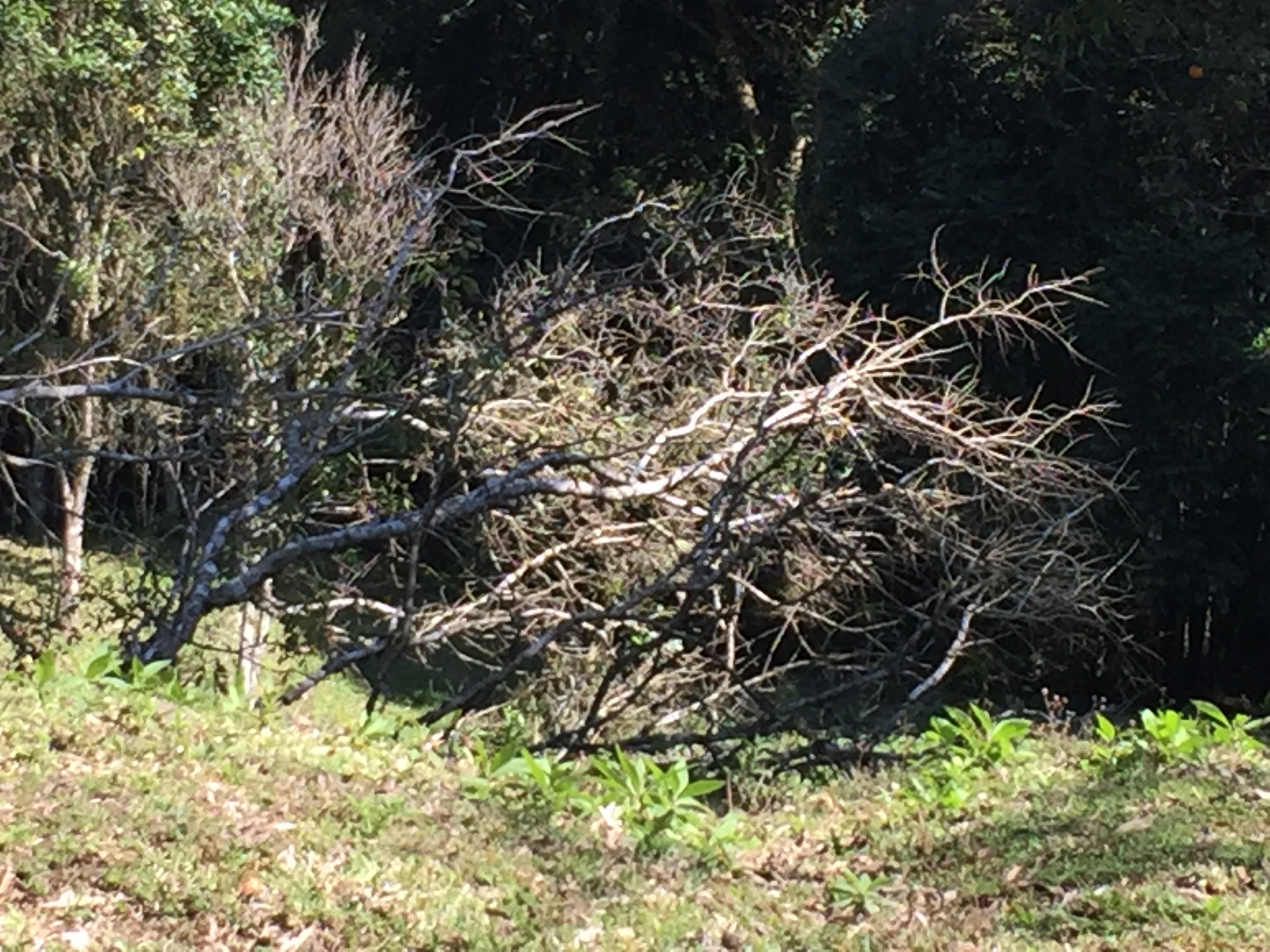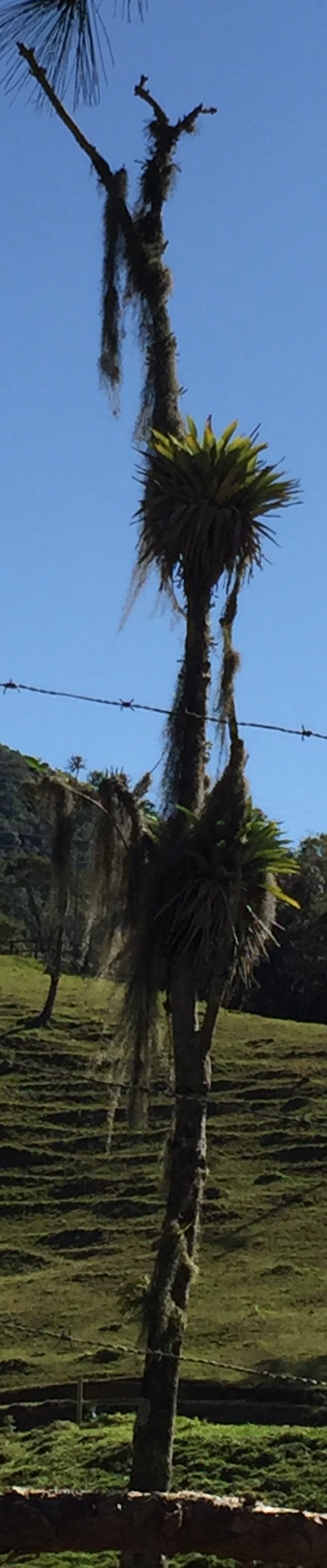 Esta imagem está mostrando uma árvore longa que é estranha pois tem duas plantas redontas grudadas na árvore e a árvore é peluda! Sei que esse tipo de pelo na árvore é um parasita para as plantas, mas e as duas plantas, o que elas são e como elas chegaram ali? bIzArRO não é?